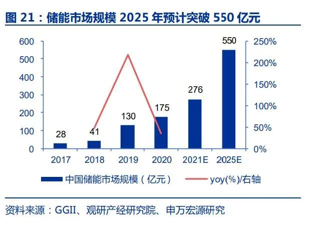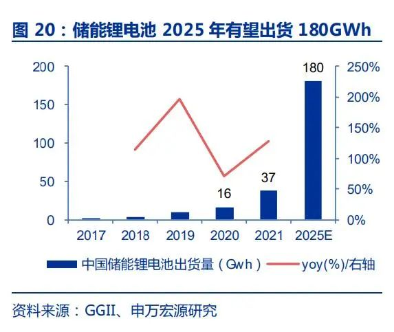 “碳中和”加速储能建设,拉动储能设备需求加速。“碳中和”已成为全球共识,电 气化进程大势所趋,储能作为电气化时代能源调节的必需品,用于支撑电力系统负荷平衡, 以储能电池为基础的储能系统成为“碳中和”发展的重要一环。目前储能广泛应用到电力 系统、通信基站、数据中心、UPS、轨道交通、人工/机器智能等领域。未来随着清洁、低 碳目标的发展,多家公司布局储能锂电池赛道,预计我国储能锂电池出货量逐年增长。, 高工产研锂电研究所(GGII)统计数据显示,2020 年储能锂电池出货量为 16.2GW,2021 年我国储能锂电池总出货量为 37GWh,同比增长超过 110%。同时 GGII 预测,至 2025 年中国储能锂电池出货量有望达到 180GWh。随着储能建设推进,对应储能设备需求加速。