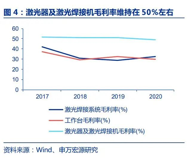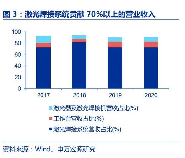 1)收入增速:激光器为整套设备中的核心部件,公司激光器作为相对 标准化的部件可单独对外出售,公司激光器具有焊接速度快、灵活性好、转化率高、能量 稳定等特点,随着下游需求高景气,预计公司 2021-2023 年激光器收入增速分别为 100.00%、180.00%、65.00%;