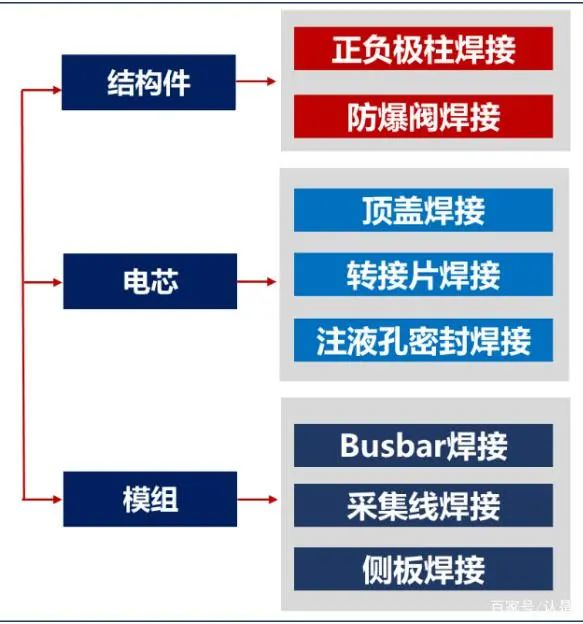 激光焊接设备可应用于电芯、模组焊接生产等环节。动力电池按照包装形式可以分为方形电池、圆柱电池、软包电池。以目前市场主流电池形态——方形电池举例,激光焊接工艺应用于:1)结构件制造环节:正负极极柱焊接、防爆阀焊接;2)电芯生产环节:顶盖焊接、密封钉焊接、转接片焊接等环节;3)模组环节:Busbar、采集线、侧板焊接等。