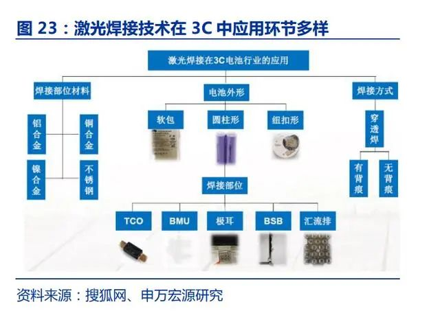 6)动力电池模组及 PACK 焊接:电池模组可以理解为锂离子电芯经串并联方式组合, 并加装单体电池监控与管理装置。电池模组的结构设计往往能决定一个电池包的性能和安全,其结构必须对电芯起到支撑、固定和保护作用,同时如何满足电流要求、电流均匀性、 对电芯温度的控制等,都将是评判电池模组优劣的标准。由于铜和铝之间采用激光焊接后易形成脆性化合物,无法满足使用要求,通常采用超声波焊接;铜和铜、铝和铝一般均采用激光焊接。同时,由于铜和铝传热均很快,且对激光反射率非常高,连接片厚度相对较大,因此需要采用较高功率的激光器才能够实现焊接。