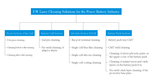 Laser cleaning is performed on the CMT welding seam of the battery pack tray, the electrophoretic paint on the upper cover of the battery pack, the oxide layer of sealant traces of the battery pack box, and the oxide layer of the protective bottom plate before welding, so as to improve the adhesion of the paste or coating glue. It will not produce harmful pollutants, and this eco-friendly cleaning method will become more and more important in the case of high attention to environmental protection.