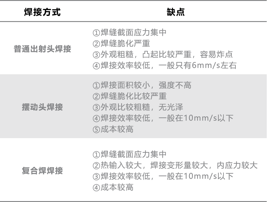 从上表可看出,尽管普通出射头焊接、摆动头焊接及复合焊焊接在各自应用领域均表现不俗,但用在硅钢电机定子焊接上也有其局限性。
