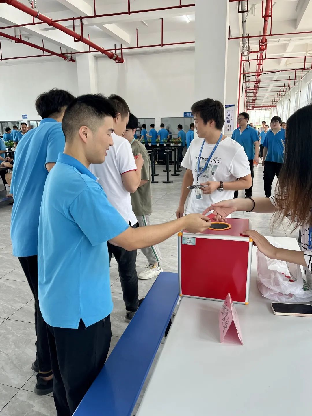 员工凭门票在工作人员的指导下有序排队,一共设置两条投壶路线。每人分得5支箭,在一米五线外投壶,投入壶中2支及以上即可获得一张抽奖券,全中5支即可获得两张抽奖券。投壶战况也是十分激烈,有的员工一发击中,轻松获得抽奖券,有的可怜娃一次都没成功,还需再接再厉。