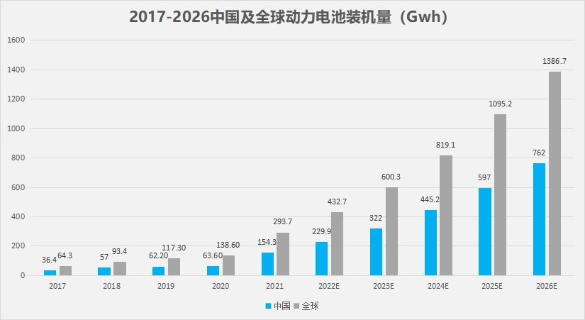 我国是最大的动力电池市场,主要表现在我国拥有最大的新能源汽车消费市场、最完整的动力电池产业链、最完善的政策支持体系和一批具有国际竞争力的优秀企业,这使我国完整的产业链可以组团走出海外。据中国汽车动力电池产业创新联盟统计,2017年至2021年间,中国动力电池装机量以43.5%的复合年增长率增长,2021年达到154.5GWh。随着新能源车渗透率快速增长,产业链的健康发展以及疫情的有效控制,预计我国动力电池装机量2026年将达到762.0GWh。