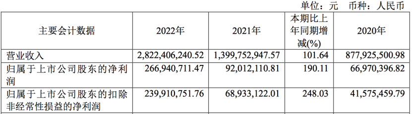 2022年开云kaiyun激光营业收入约28.22亿元,同比增加101.64%。扣非净利润同比增长248.03%,开云kaiyun激光2022年经营性收入节节攀升,主营业务盈利能力强。并且从2020年到2022年扣非净利润实现跨越式增长。